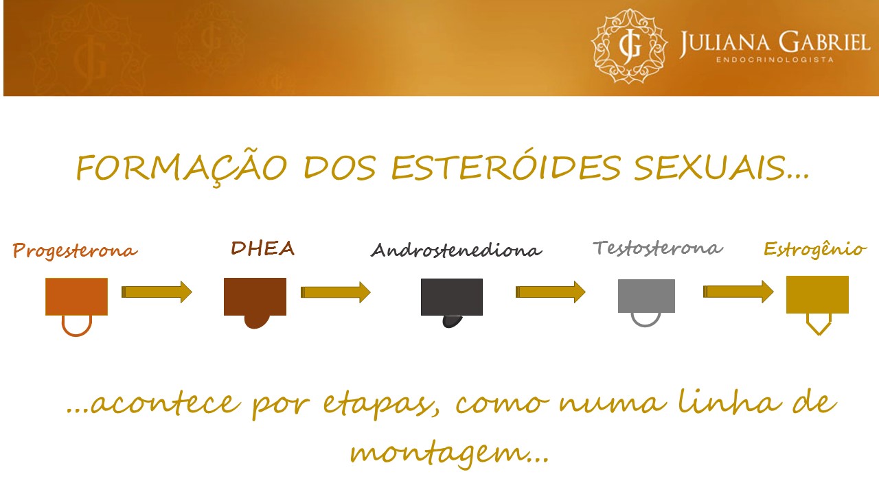 Para que a mulher consiga produzir Estrogênio à partir do colesterol, este precisa passar por várias etapas e uma delas é a progesterona, DHEA e androstenediona, como na figura acima.